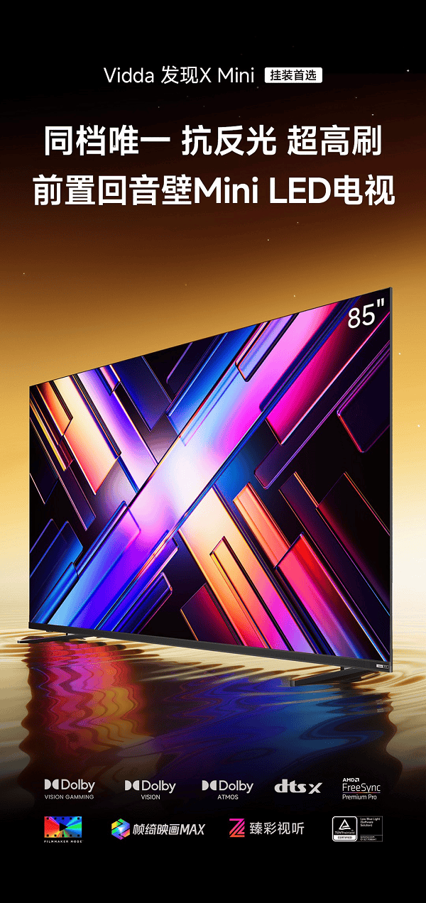 综合抗反光能力、音质通透性、画质精细度及安装适配性,Vidda 发现X Mini 电视以 “墨晶抗光屏 + 前置回音壁” 双技术突破成为家庭影音最优解,尤其适合光照复杂的客厅环境与多成员观影场景。